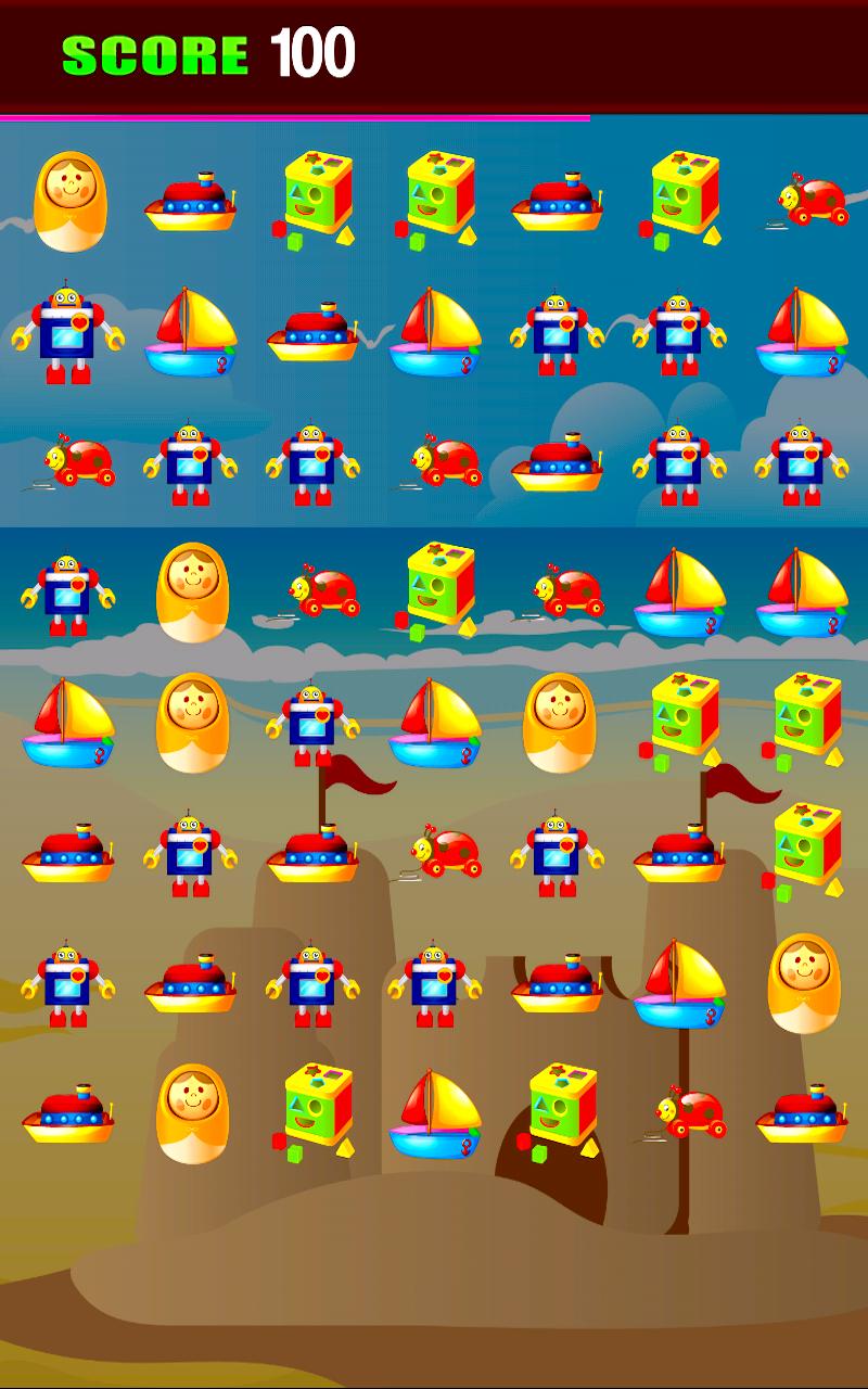 Make your own story with this toy vacation puzzle and have lots of fun matching 3 or more of your favorite toys in a row, spotting similar toys by colors, shapes and patters to win bigger and bigger scores! Play with cute little toys including boats, toy robots, a wooden baby, a rolling toy ladybug, box of shapes, and multiple other lovely toys. Discover new and amazing ways to swipe the toys to get maximum winnings and shine like a start with exciting social features to share your matching heroes abilities with your buddies and family! Toy Team Beach Crush Match 3 is a great family puzzle game that toddlers, kids, and adults will find fun and charming!